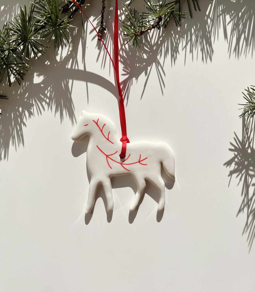 Keramički ukras za božićno drvce u obliku konja. Ručni rad i spoj hrvatske tradicije i dizajna u jednom proizvodu.